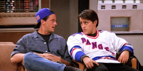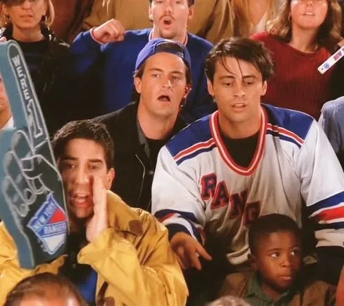 시즌1 에피소드 4를 보면 조이, 챈들러, 로스 남자 3인방이 하키 경기를 보러 갑니다. 그때 조이가 입고 있던 유니폼이 다름 아닌 뉴욕 레인저스 어웨이 유니폼. 프렌즈의 배경이 뉴욕인 만큼 이는 어찌 보면 당연지사겠죠. 조이는 맥주와 나쵸칩을 곁들이며 스포츠 경기를 보는 미국 남자의 전형이거든요. 그가 소화해 낸 블록코어룩이 참으로 멋스럽게 잘 어울립니다.