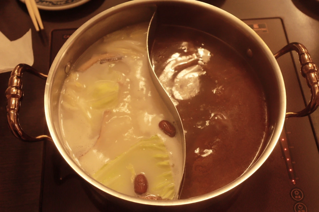 다른 국물 반반도 가능하지만, 원앙훠궈라 하면 대부분 백탕과 마라탕 조합을 떠올린다.