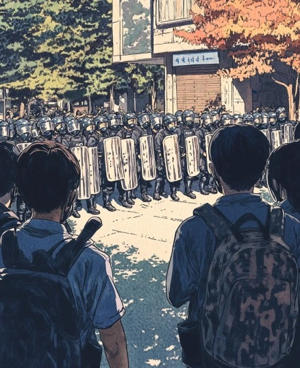 "조심해야겠는걸. 전경에게 잡히면 경찰서에 가게 될지도 몰라"