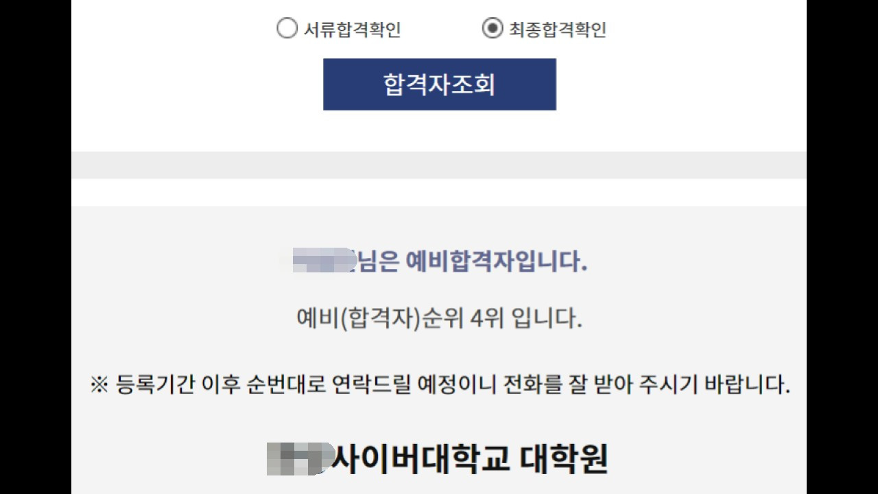예상대로였다. 결과를 발표하던 날, 지원사이트에서 결과를 확인했다. 불합격이었다. 그런데 애매한 문구가 적혀 있었다. 불합격이지만 예비합격 4위라는 것이었다. 예비합격이란 추가합격 가능성이 있다는 의미였다. 불합격이지만 합격자 중에서 포기자 등 결원이 발생할 경우에 추가로 합격시켜 주겠다는 말이었다. 포기자가 발생하면 예비 1위부터 전화연락을 하겠다고 적혀 있었다. 하지만 예비 4위가 추가합격할 가능성은 매우 적을 것 같았다.