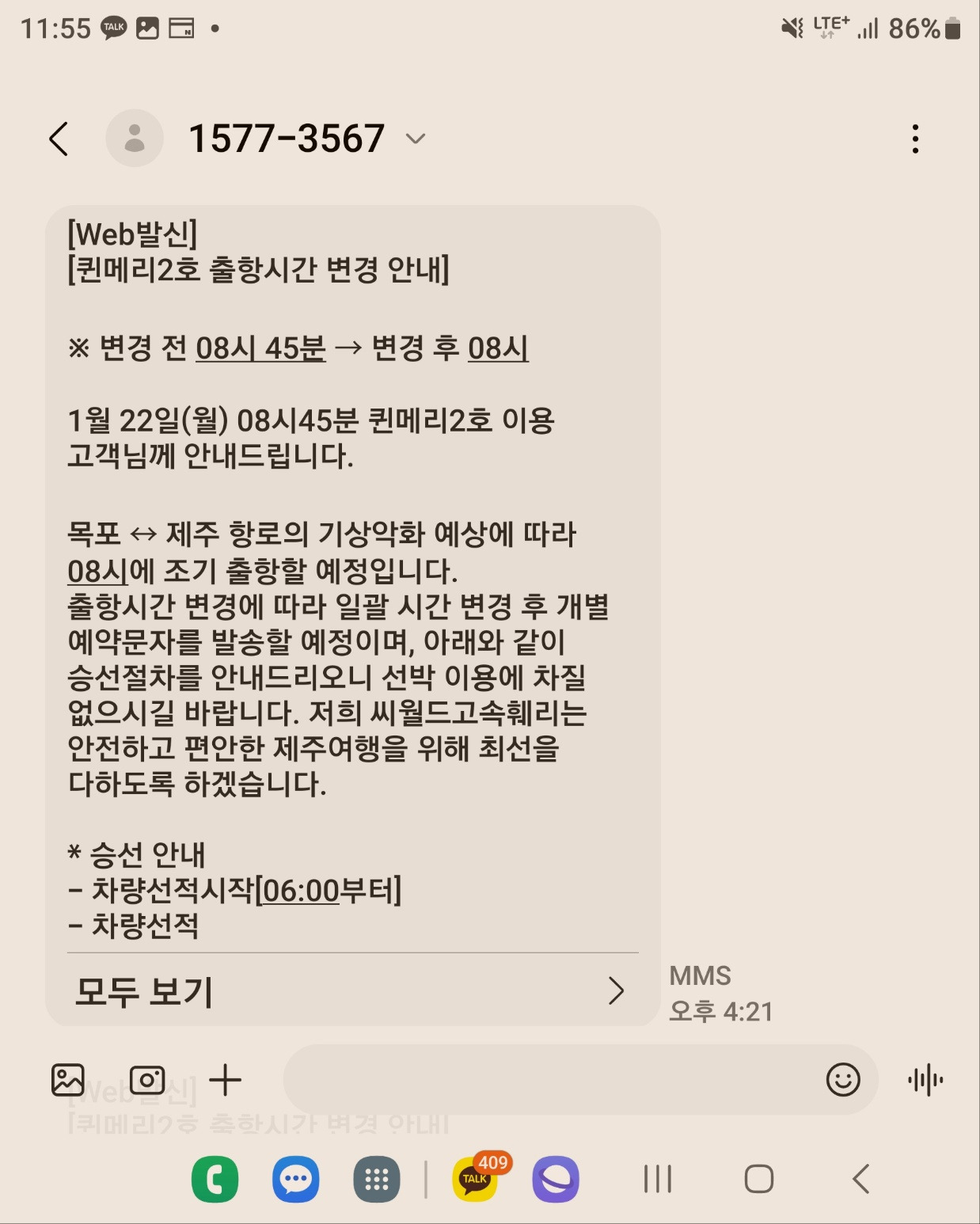 제주도로 가기 전날인 1월 21일 오후 한 통의 문자를 받았다. 해운회사로부터 온 문자였다. 문자의 내용은 페리가 출발하는 날인 1월 22일 기상악화가 예상된다는 것이었다. 이에 따라 출항 시간이 출발일 오전 8시 45분에서 오전 8시로 45분이 앞당겨진다는 것이었다. 뭔가 좋지 않은 느낌은 있었지만 예전에도 타 본 경험이 있는 대형 카페리(Car Ferry)라 별다른 문제는 생기지 않을 것 같았다.