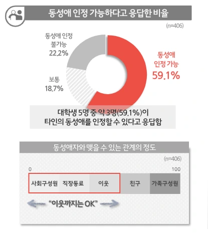 2019년 대학내일에서 발표한 대학생을 대상으로 한 동성애 설문조사 결과를 보면, 점점 더 많은 대학생들이 동성애를 인정해야 한다는 의견을 갖고는 있지만 동시에 여전히 친구 이상으로 동성애자를 두는 것에는 거부감을 갖고 있는 것으로 밝혀졌다. 나는 이 결과가 한국의 동성애 문화의 현실이라고 생각한다. 인정은 할 수 있지만, 여전히 '남의 이야기'로 치부하는 것.
