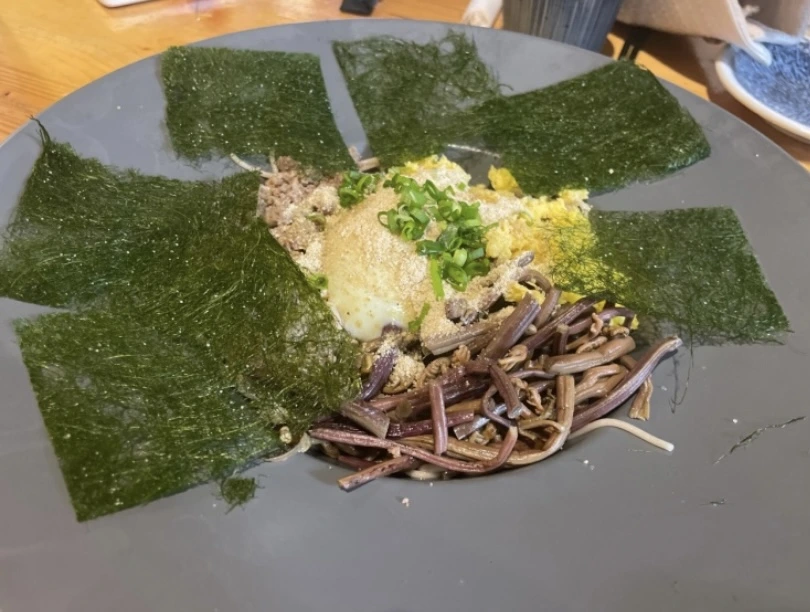 고사리와 다진 소고기에 들기름을 올린 소바로 감태와 함께 먹으면 건강식 그 자체다.