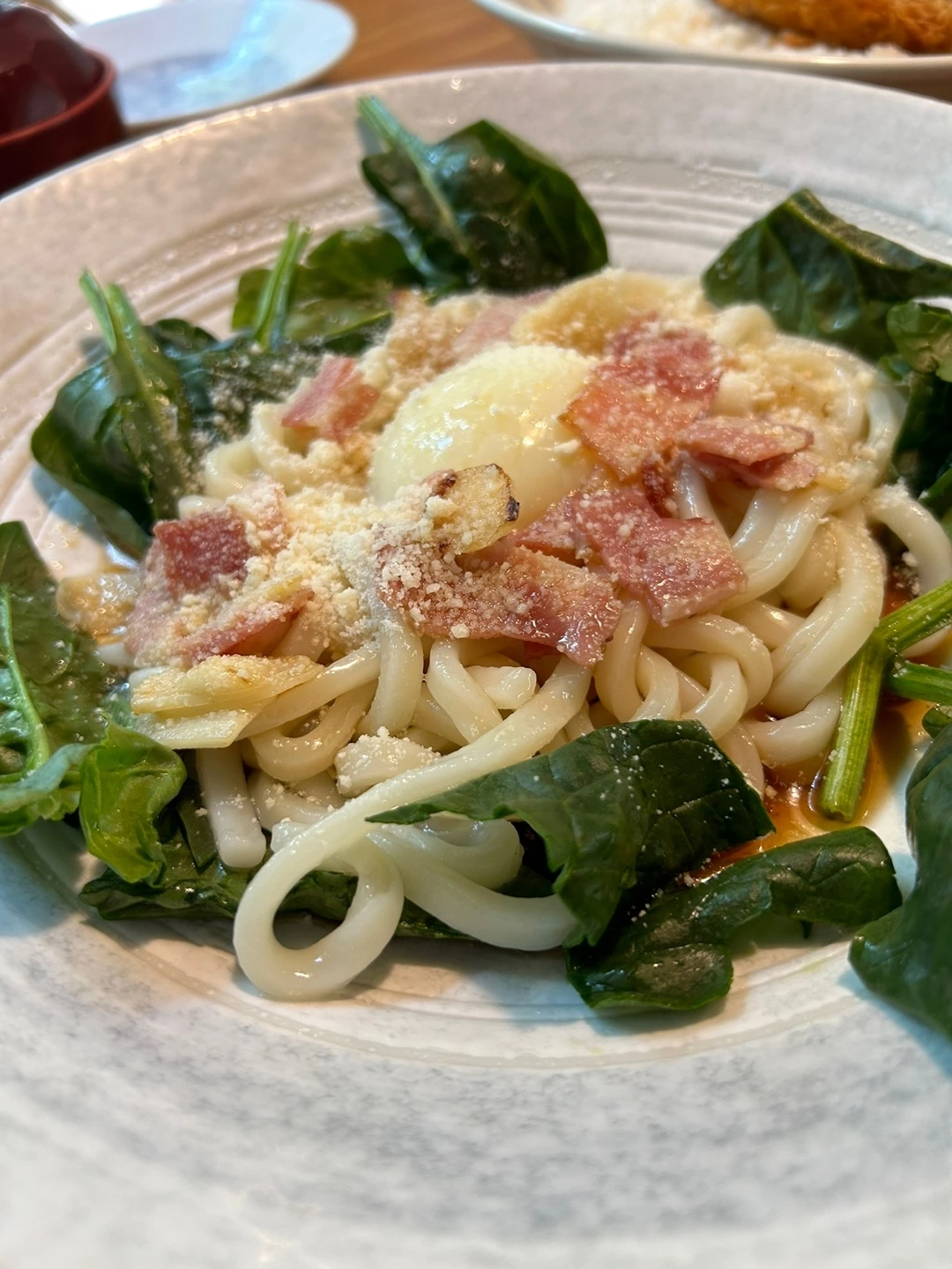 시금치와 베이컨, 온천달걀이 올라간 우동이다. 짜지 않은 건강한 맛이다.