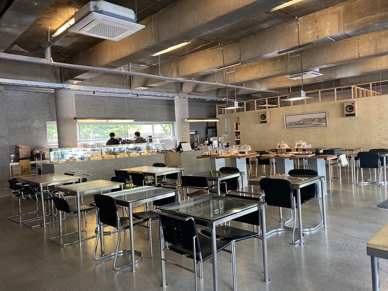 높은 천정고와 넓직한 공간. 모던 색감과 테이블, 체어 모두 카페 분위기와 어우러진다.