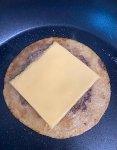 4. 1분 정도 반대편 면을 익히다 보면, 치즈가 뜨거운 고기에 살살 녹게 되지. 그리고 불을 끄고, 접시에 구워진 또띠아를 옮겨 놓거라.