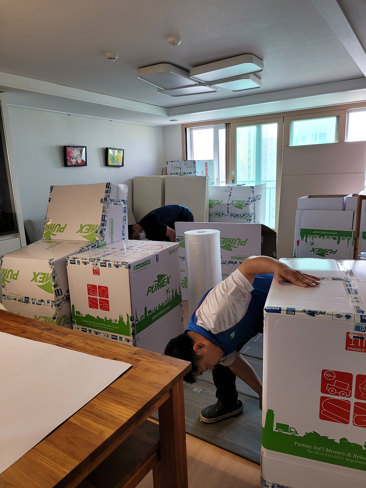 일반 이사와 다르게 해외이사 전문으로 하시는 분들은 그런걸 이미 알고 계시고, 매우 배태랑인 분들이라 전혀 당황하시지 않으시는데 짐을 싸다보니 생각보다 더 많이 늘었다고 하시며...어쩌면 1박 2일을 포장해야 할 수도 있다고 하셨는데, 다행히도 근처에서 일이 빨리 끝난 다른 분들이 3분이 더 오셔서 우리집은 짐과 인부들로 발딛을 틈이 없었다. 해외이사는 만들어진 플라스틱상자나 단프라 박스같은 상자로 보내지 않고, 해당 물건에 맞춰서 상자를 그 모양대로 접고 만들어 각 모서리마다 다 테이핑 처리를 해서 완전 포장 된 상태로 컨테이너에 실리게 된다. 말로만 설명하는 것으로는 그 묘사가 부족할 정도로 엄청 엄청 전문가분들이 포장을 해주신다.