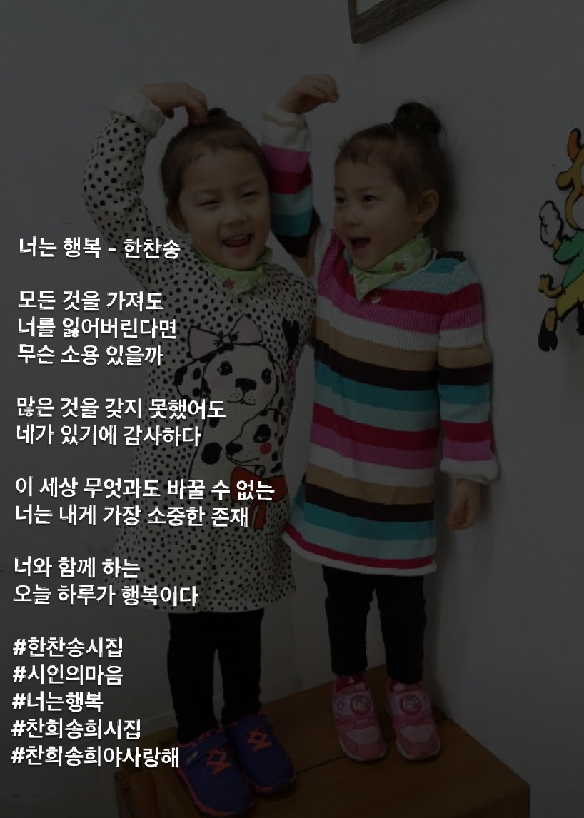 너는 행복 - 한찬송모든 것을 가져도너를 잃어버린다면무슨 소용 있을까많은 것을 갖지 못했어도네가 있기에 감사하다이 세상 무엇과도 바꿀 수 없는너는 내게 가장 소중한 존재너와 함께 하는 오늘 하루가 행복이다#한찬송시집#시인의마음#너는행복#찬희송희시집#찬희송희야사랑해
