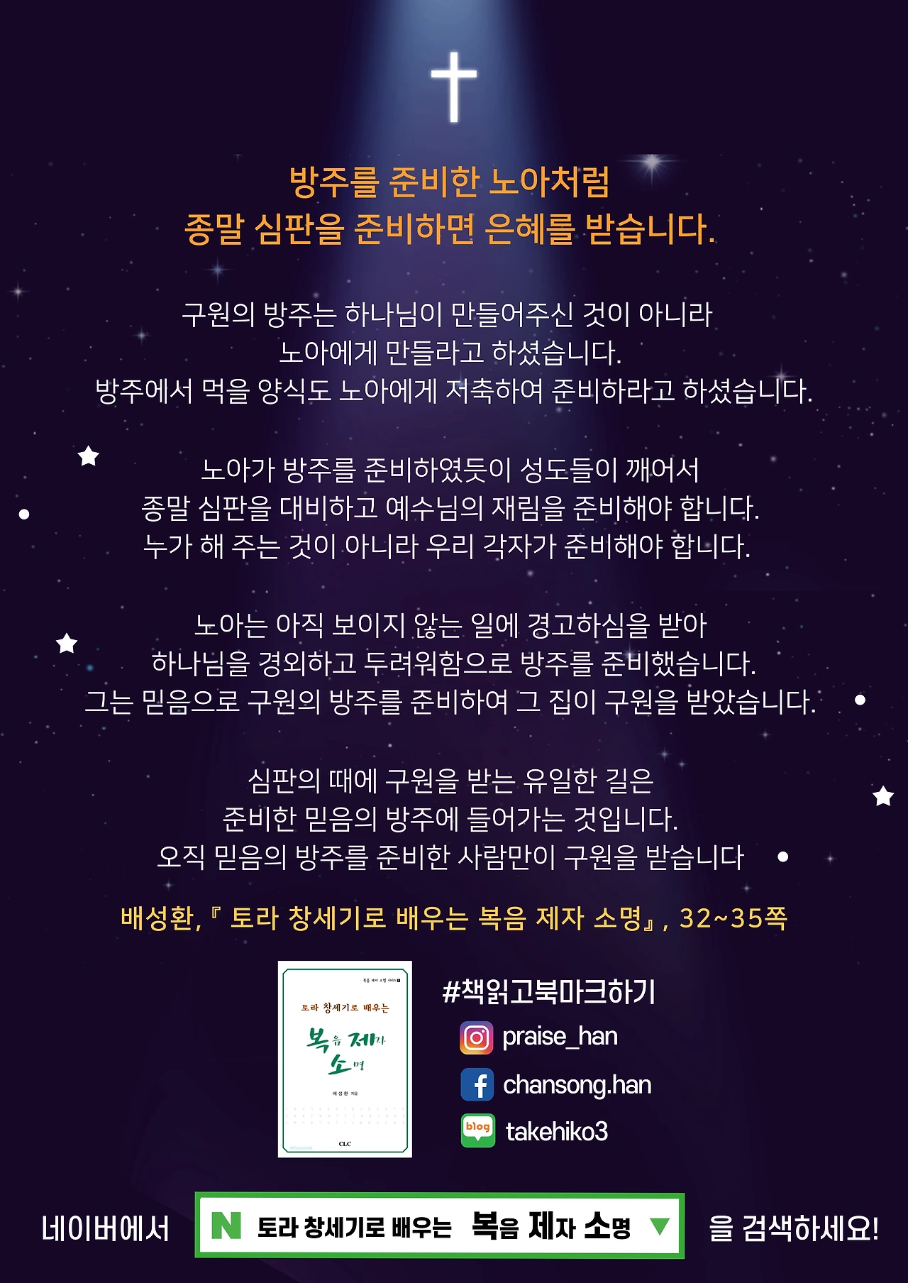 #방주를준비한노아처럼#종말심판을준비하면은혜를받습니다#복제소창세기_32_35페이지 #배성환목사#책읽고북마크하기 #한찬송목사