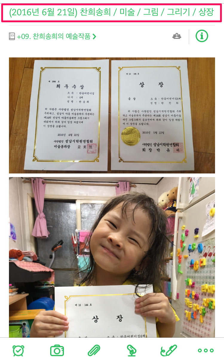 딸아이가 어린이집에서 상장을 받아왔네요^^
