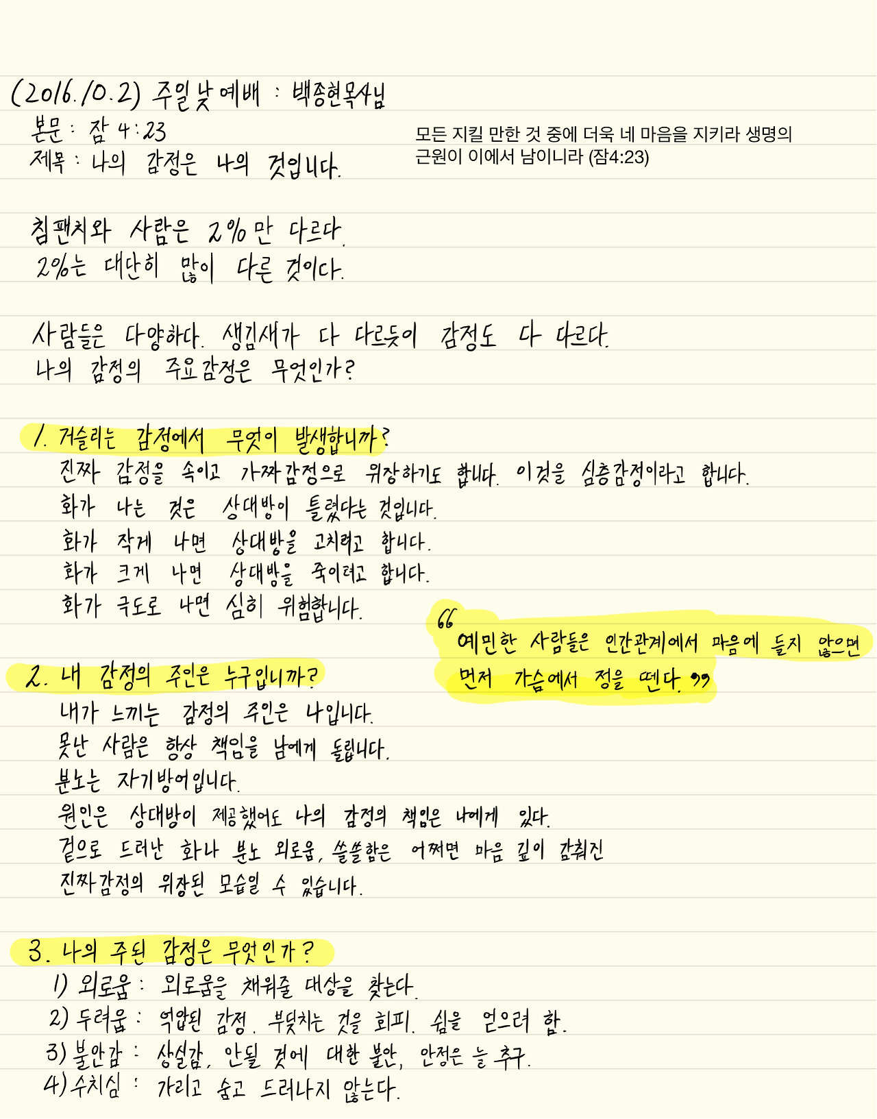 #설교노트 #백종현목사 #나의감정은나의것입니다 #잠4장23절