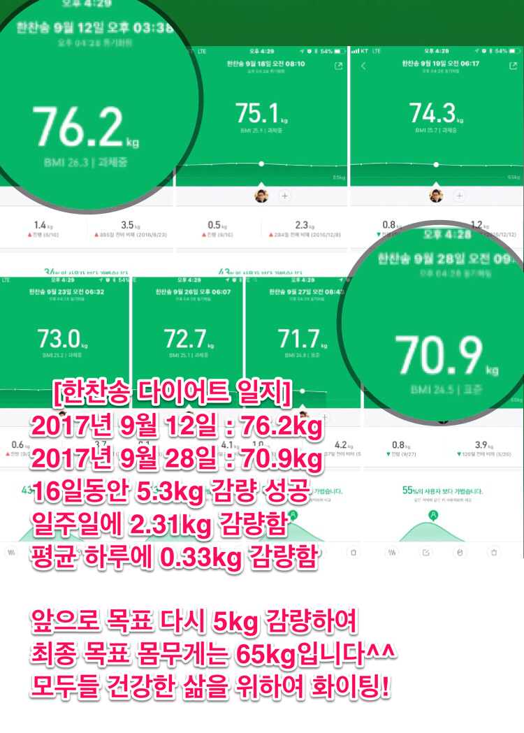 #한찬송 #다이어트 #일지#16일동안 #5_3kg감량#일주일평균2_3kg감량#하루평균0_3kg감량#앞으로다시5kg감량목표#최종목표는65kg입니다#이루고싶은게있다면체력을길러라#미생명언 #건강한삶 #균형잡힌삶#에버노트절대강자 #에버노트 #건강기록
