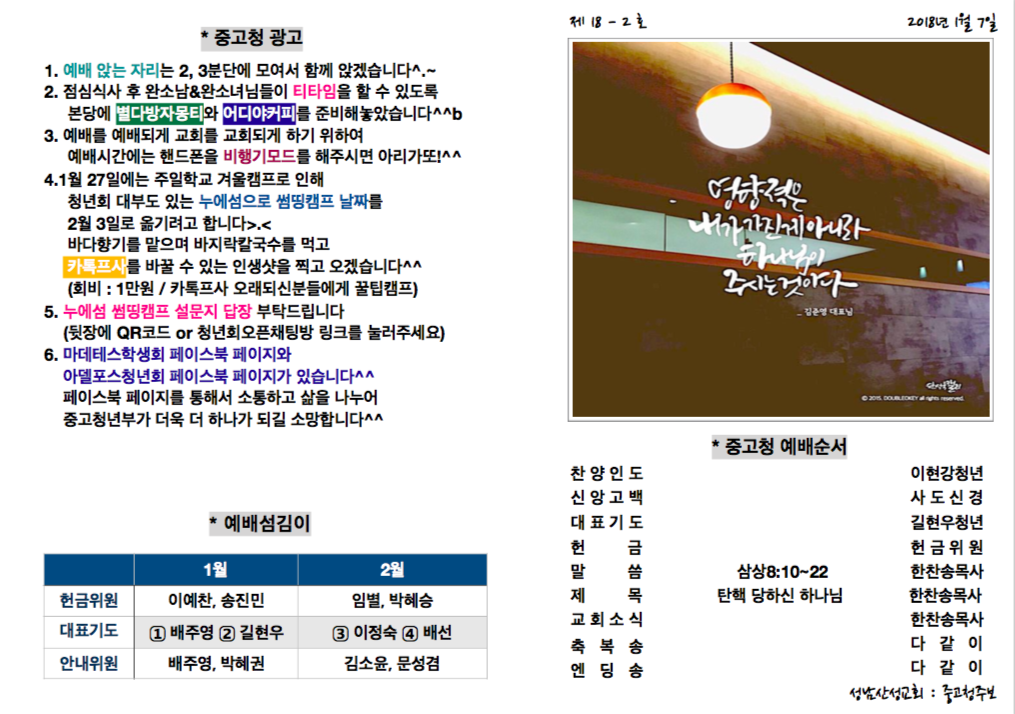 #성남산성교회 #중고청예배주보 #2018년1월14일#삼상8장 #탄핵당하신하나님 #한찬송목사#하나님을버린백성 #하나님을버린백성에게일어날일#하나님을버린백성의말을들어주시는하나님#별다방자몽티 #어디야커피 #누에섬썸띵캠프#성격유형검사 #탁구오브레전드 #1대장#오픈채팅방드루와루와 #추천CCM들어봤나요