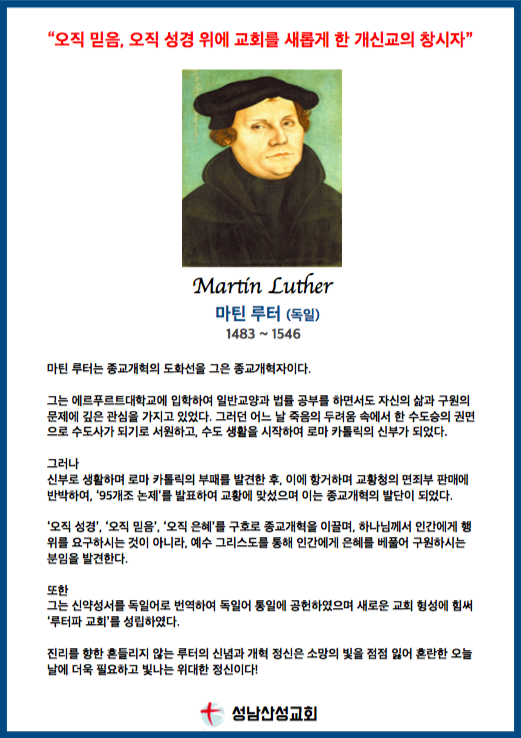 #성남산성교회 #계단벽면꾸미기#종교개혁자 #루터 #칼빈#청교도신학자 #존오웬 #조나단에드워즈#선교사 #언더우드 #아펜젤러#A3칼라프린트 #코팅 #우드락 #한찬송
