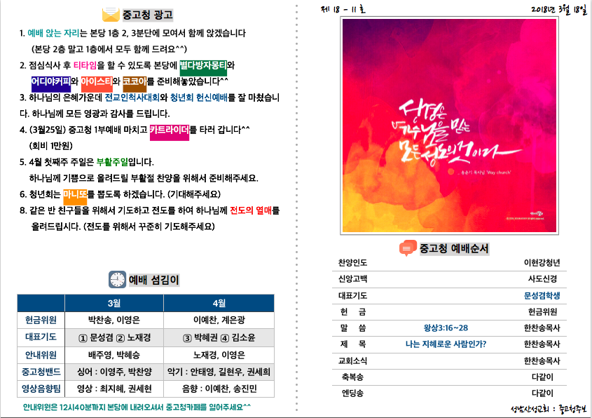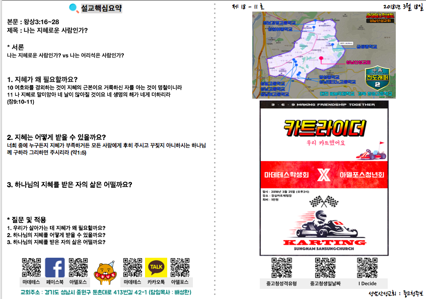 #성남산성교회 #중고청예배주보 #2018년3월18일#주보캘리그라피 #성경은예수님을믿는모든성도의것이다#왕상3장 #나는지혜로운사람인가 #한찬송목사#1_지혜가왜필요할까요#2_지혜는어떻게받을수있을까요#3_하나님의지혜를받은자의삶은어떨까요#전도래퍼 #카트라이더 #부활절찬양준비#추천CCM #IDecide #헤리티지