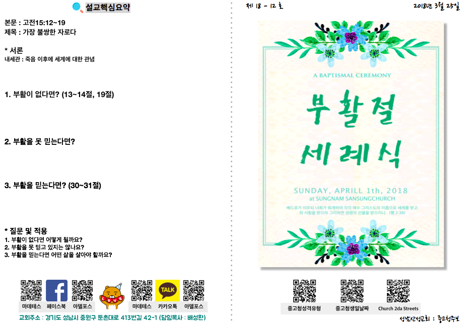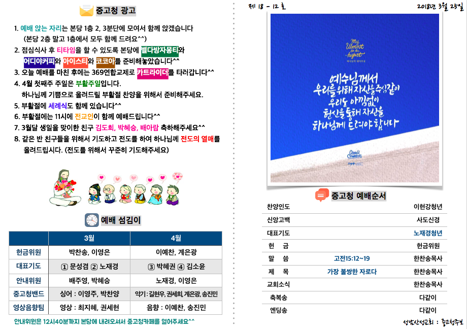 #성남산성교회 #중고청예배주보 #2018년3월25일#주보캘리그라피 #예수님께서우리를위해자신을주심같이#우리도아낌없이헌신을통해자신을#하나님께드려야합니다#고전15장 #가장불쌍한자로다 #한찬송목사#1_부활이없다면#2_부활을못믿는다면#3_부활을믿는다면#카트라이더 #부활절찬양준비 #부활절세례식#3월생일축하 #김도희 #박혜승 #배아람#추천CCM #Church2DaStreets #조PD
