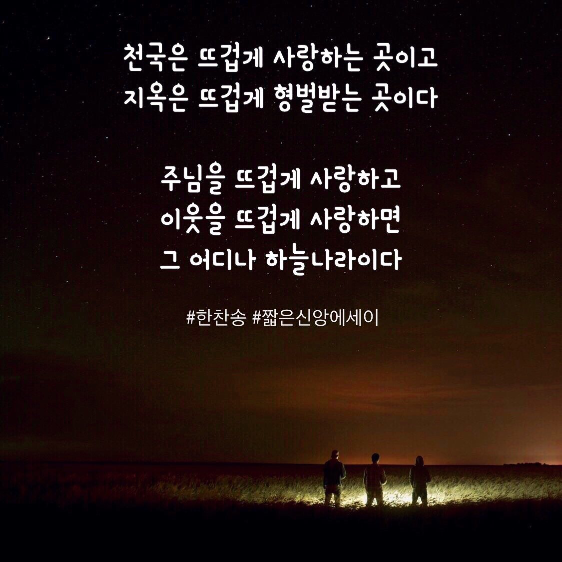 [짧은신앙에세이] 뜨겁게 서로 사랑하면.#천국은뜨겁게사랑하는곳이고#지옥은뜨겁게형벌받는곳이다#주님을뜨겁게사랑하고#이웃을뜨겁게사랑하면#그어디나하늘나라이다#뜨겁게서로사랑하면#그곳이바로천국이다#한찬송 #짧은신앙에세이.무엇보다도 뜨겁게 서로 사랑할지니 사랑은 허다한 죄를 덮느니라 (벧전4:8).또 여기 있다 저기 있다고도 못하리니 하나님의 나라는 너희 안에 있느니라 (눅17:21)