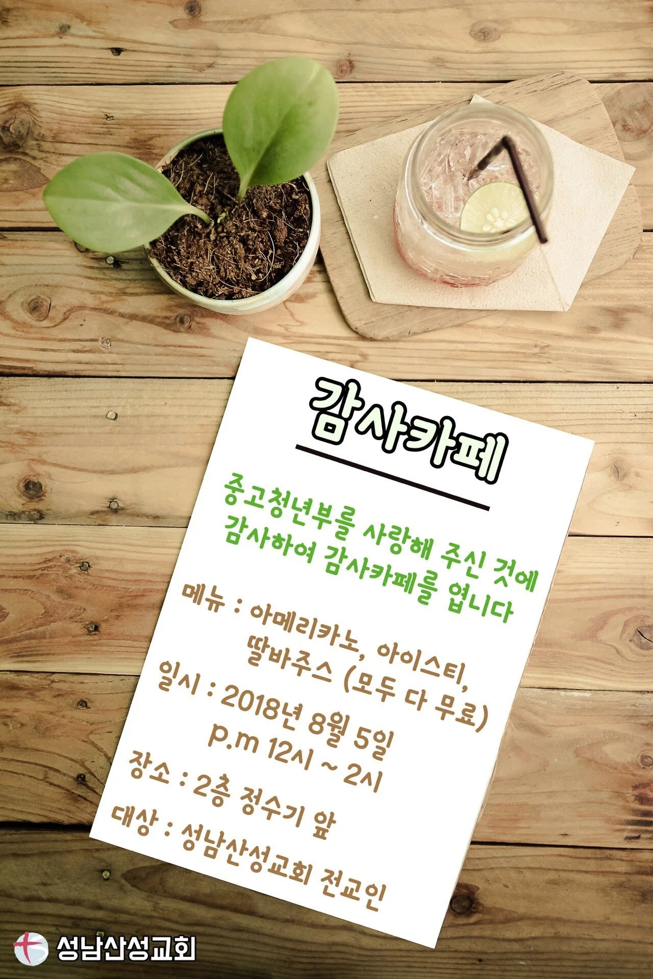 [감사카페].중고청년부를 사랑해 주신 것에감사하여 감사카페를 엽니다^^.메뉴 : 아메리카노, 아이스티, 딸바주스 (모두 다 무료입니다)일시 : 2018년 8월 5일 오후12시~2시장소 : 2층 정수기 앞대상 : 성남산성교회 전교인.#성남산성교회 #마데테스학생회 #아델포스청년회#감사카페 #사랑해주셔서감사합니다 #한찬송