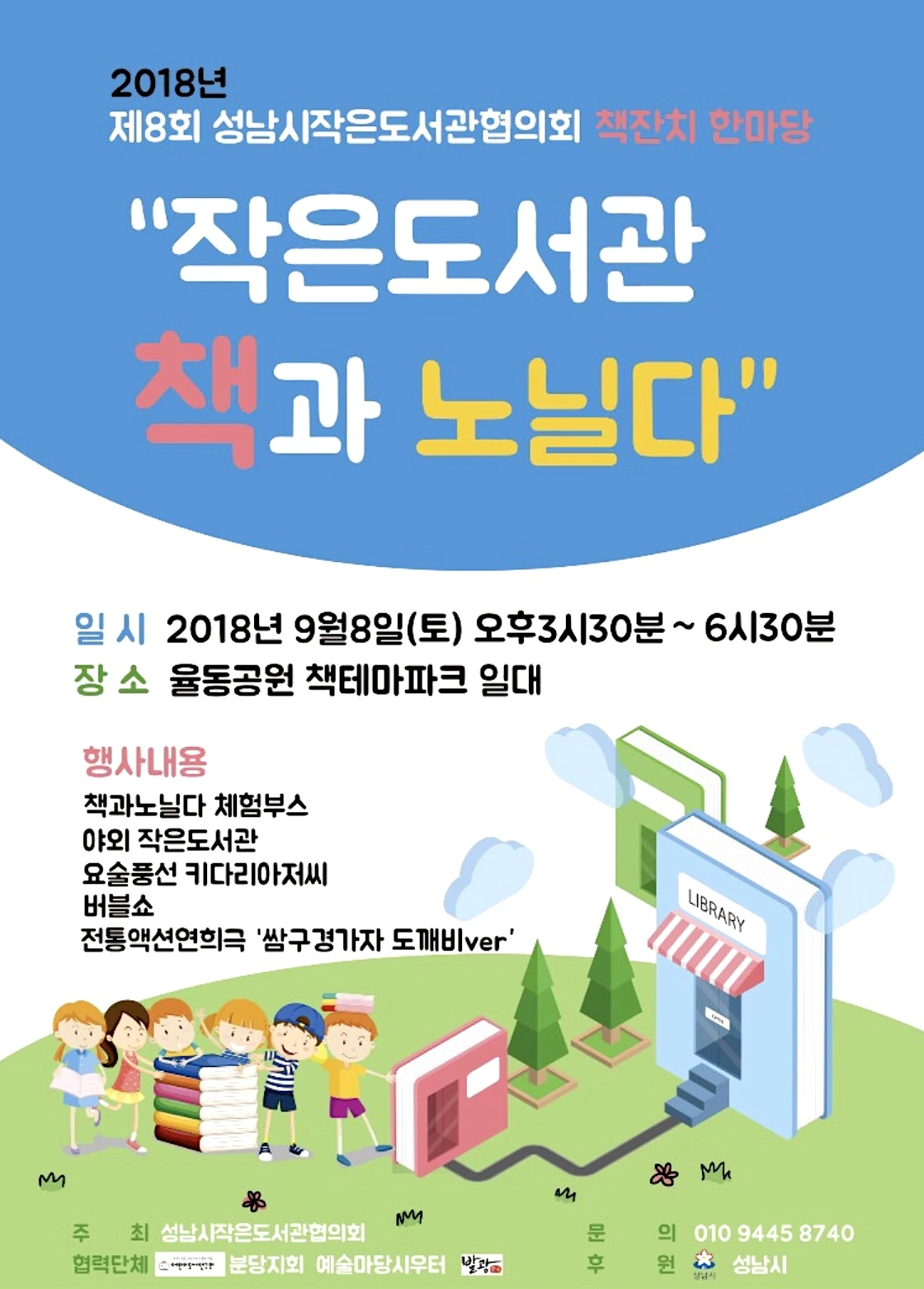 2018년 "작은도서관 책과 노닐다".일시 : 2018년 9월 8일(토) 오후3시30분장소 : 율동공원 책테마파크행사내용 : 책과노닐다 체험부스, 야외작은도서관 요술풍선 키다리아저씨, 버블쇼 전통액션연희극 "쌈구경가자 도깨비ver".#성남시작은도서관협의회 #책잔치한마당 #예꿈작은도서관 #성남산성교회 #한찬송