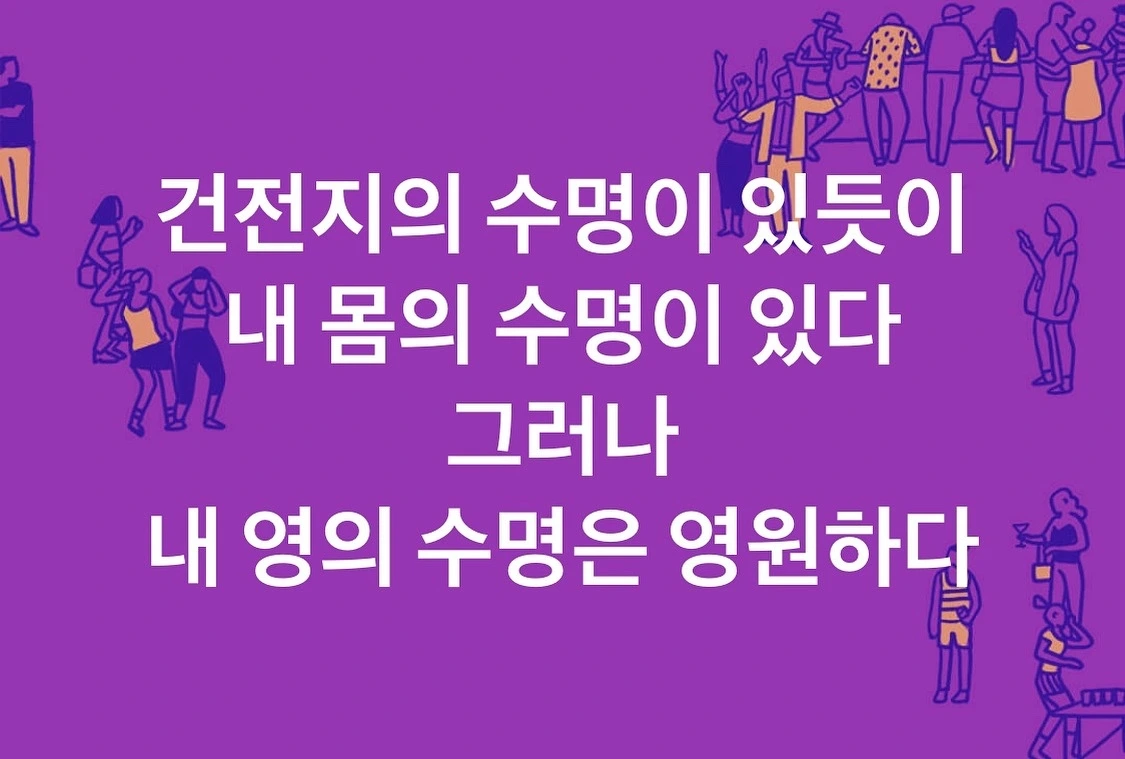 [짧은신앙에세이] 영의 수명은 영원합니다.#건전지의수명이있듯이#내몸의수명이있다#그러나#내영의수명은영원하다.때로는 육체가 점점 늙고 병들어 가는 것 때문에낙심이 됩니다..하지만영은 예수님으로 인해 영원한 생명을 얻은 것을기억함으로 다시금 소망을 갖게 됩니다..#한찬송 #짧은신앙에세이.그러므로 우리가 낙심하지 아니하노니 우리의 겉사람은 낡아지나 우리의 속사람은 날로 새로워지도다 (고후4:16)