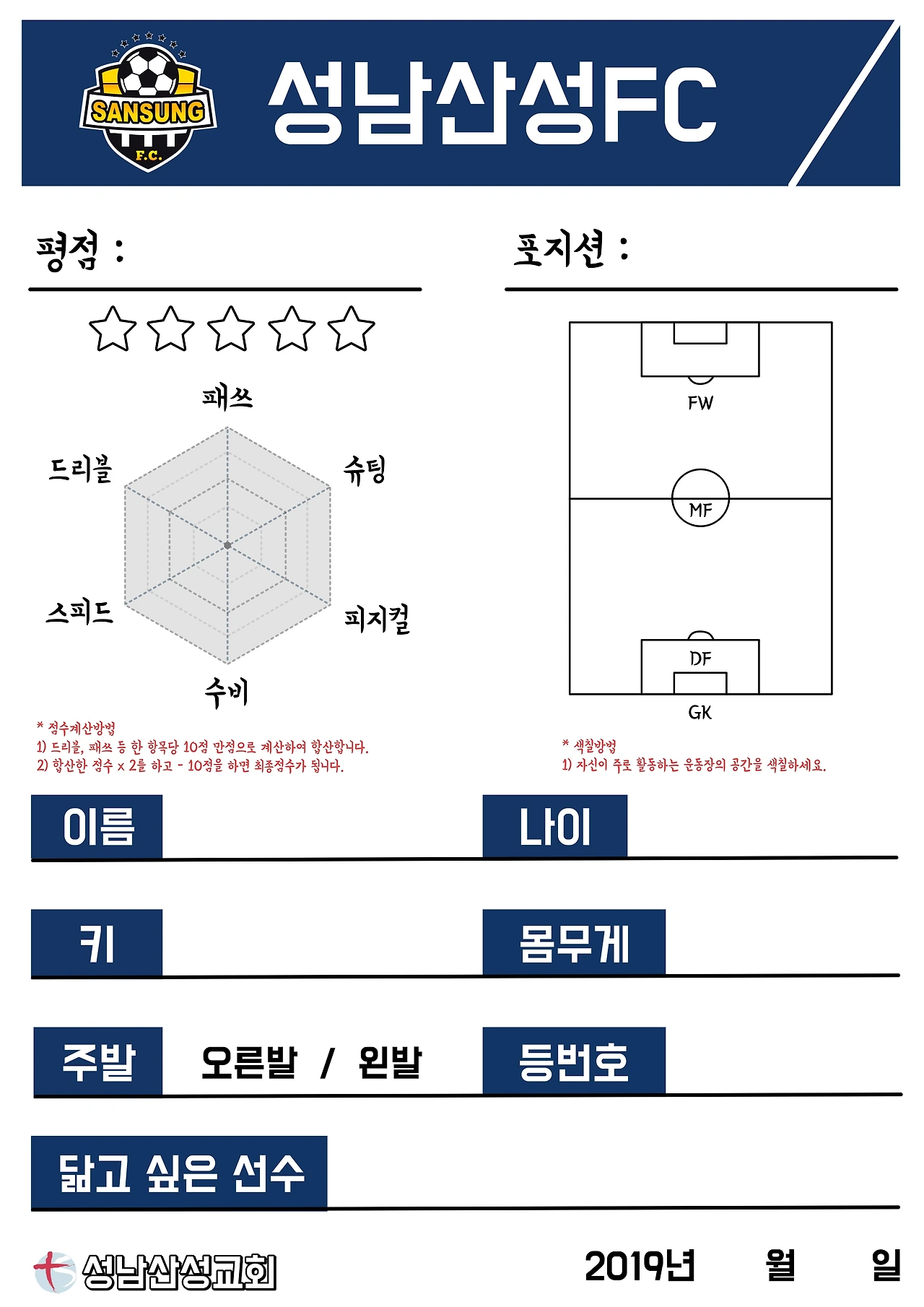 [성남산성FC : 선수정보].자신의 축구평점을 본인이 스스로 체크해보는축구평점설문지를 만들어보았습니다^^.이번주 토요일에 축구를 마치고아이들과 한 번 해보려고 합니다^^.나의 축구 실력 점수는 몇점일까?스스로 체크해봅시다..#성남산성FC #축구평점 #선수정보#자가진단 #나의축구실력점수는 #스스로체크해보는 #설문지 #한찬송