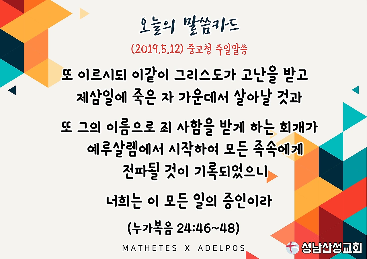 #오늘의말씀카드 #성남산성교회#2019년5월12일 #누가복음24장46_48절#마데테스학생회 #아델포스청년회 #한찬송