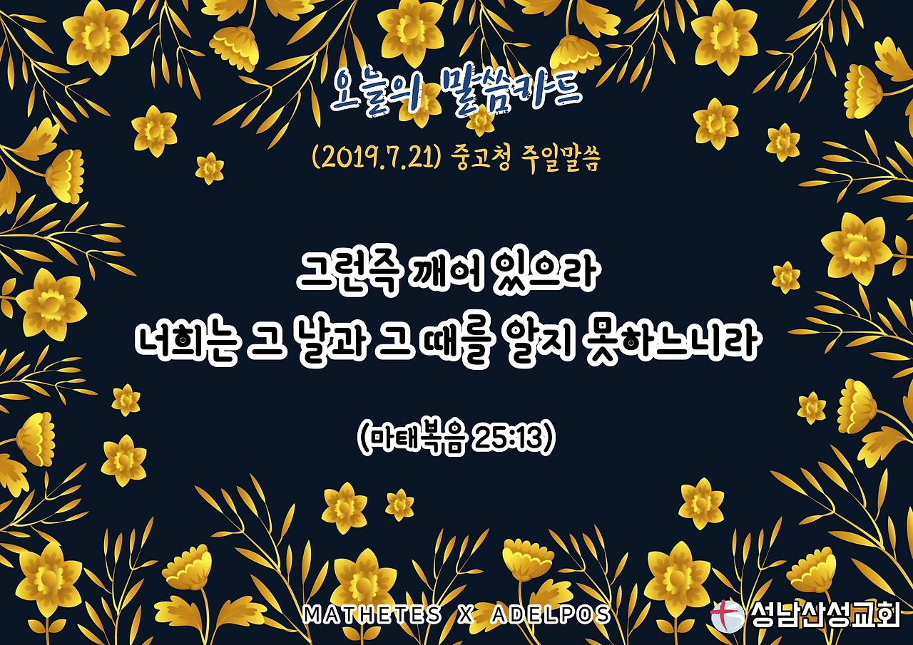 #오늘의말씀카드 #성남산성교회#2019년7월21일 #마태복음25장13절#마데테스학생회 #아델포스청년회 #한찬송