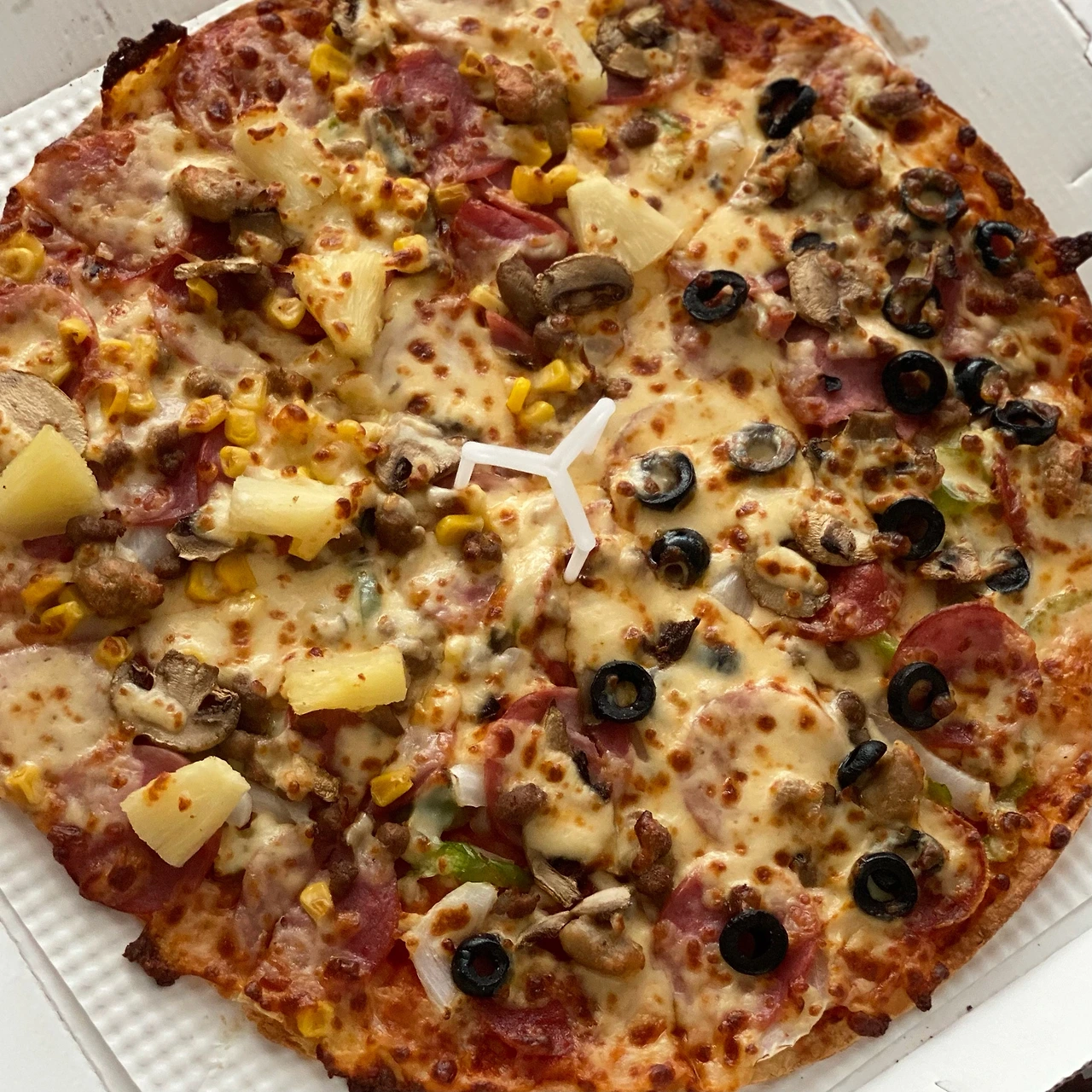 보통 슈퍼디럭스로 먹지만 집에 하와이안 피자를 싫어하는 사람이 따로 없어서 슈퍼슈프림을 섞어봤다. 그런데 급하게 주문하느라 도우를 씬으로 눌러서 모든 게 엉망이 되었다.