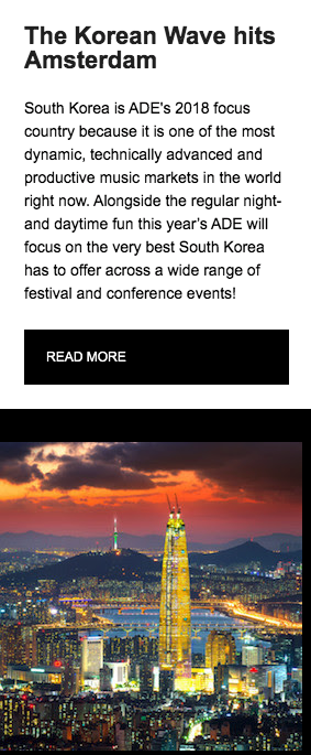 그러던 3월의 어느 날 ADE로부터 깜짝 놀랄 뉴스레터를 받았다. 이전 연도의 중국에 이어 올해는 한국을 포커싱 하겠다는 것. 쉽게 말해 한국을 주빈국으로 선정했다는 것이다.
