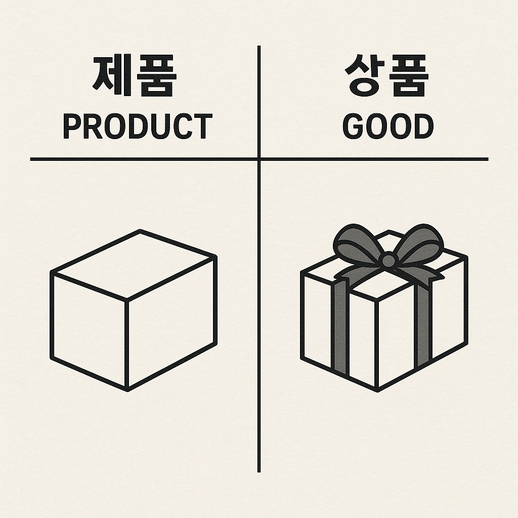 제품(Product)과 상품(Goods)은 의미가 비슷한 단어처럼 보이지만, 생각보다 많이 다른 뜻이다. 제품은 누군가에 의해 생산 또는 제조된 물품을 뜻한다. 상품은 소비자에게 판매할 수 있는 물품 또는 서비스, 거꾸로 말하면 소비자가 구매하고자 하는 물품 또는 서비스라고 정의할 수 있겠다.