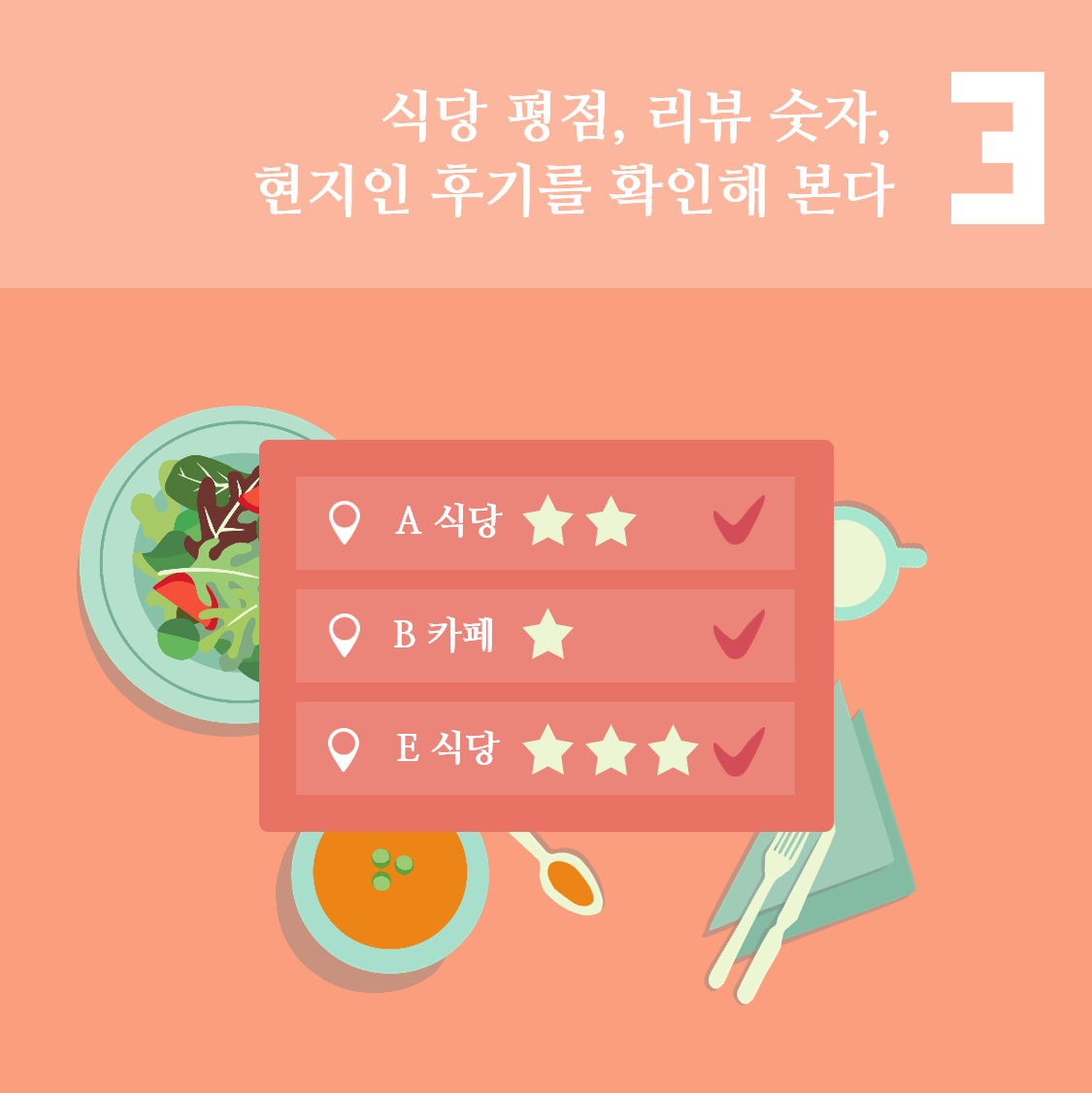 식당 선정을 예로 들면, 내가 여행하는 방법은 이러하다.