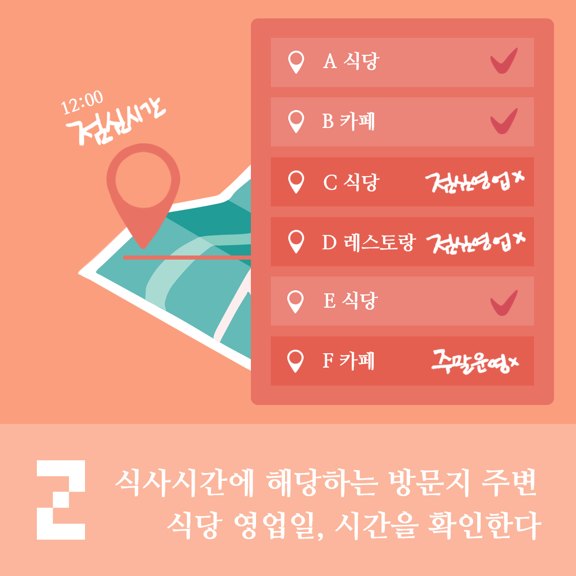 2. 식사시간에 해당하는 방문지를 지도 중심에 놓고, 인근 식당 전체를 지도에 띄운다. 영업 날짜와 시간을 확인해 휴무인 곳과 영업시간 외인 곳을 거른다.