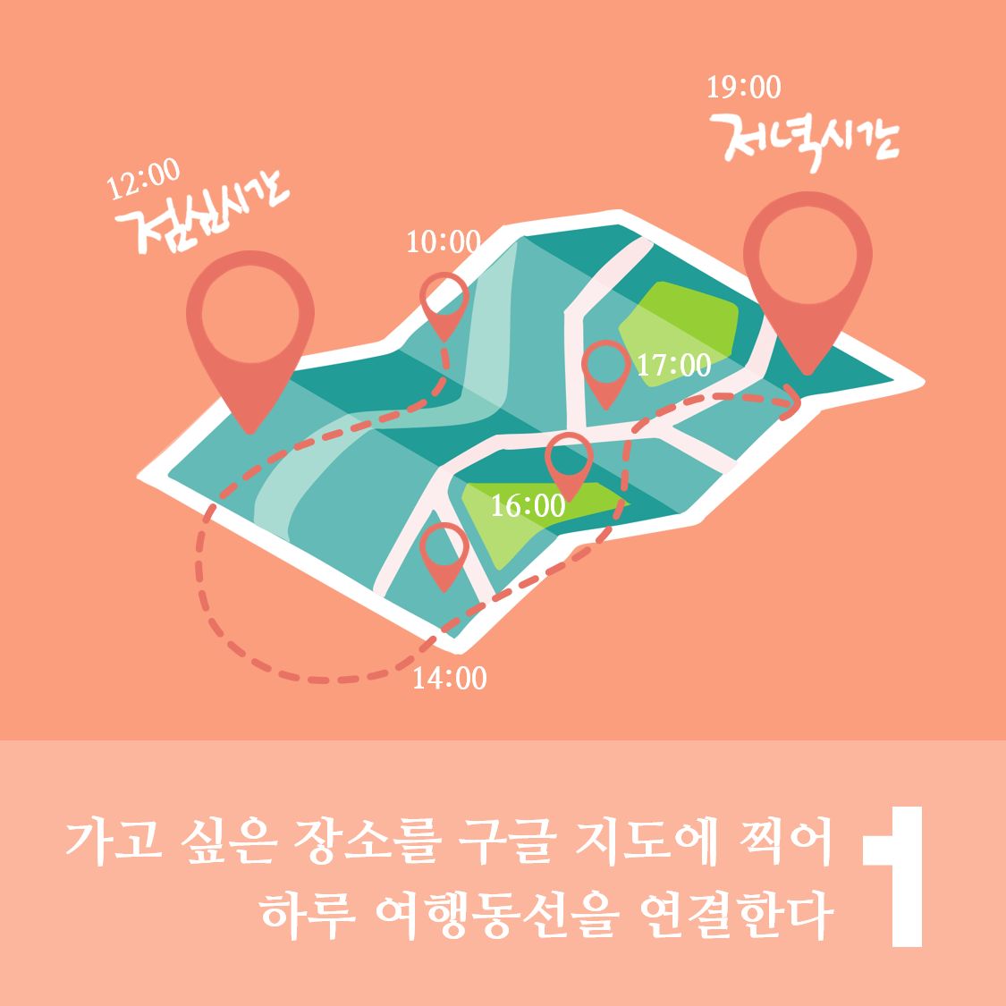 1. 가고 싶은 장소를 구글 지도에 찍어 하루 여행 동선을 연결한다.
