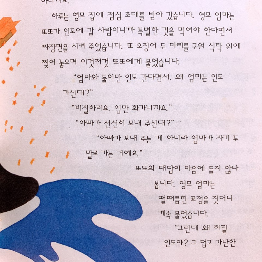 1994년 초등학교에 입학한 해엔 강석경 작가님이 쓴 <인도로 간 또또>라는 책을 선물해주었다. 또또라는 꼬마가 엄마와 둘이서 인도로 떠나고, 그곳에서 살아가는 이야기를 그린 동화였다. 책에는 이런 대화가 나왔다.