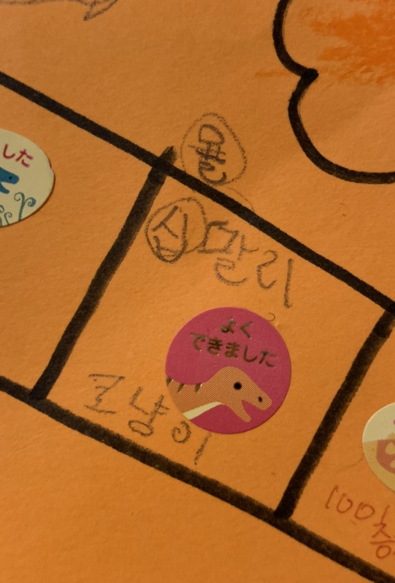 몇 분 후 아이 독서 기록장에 '참 잘했어요' 스티커를 붙인 남편은, 책 제목을 굳이 한국어로 기록하겠다고 골똘히 궁리하다 연필을 든다.