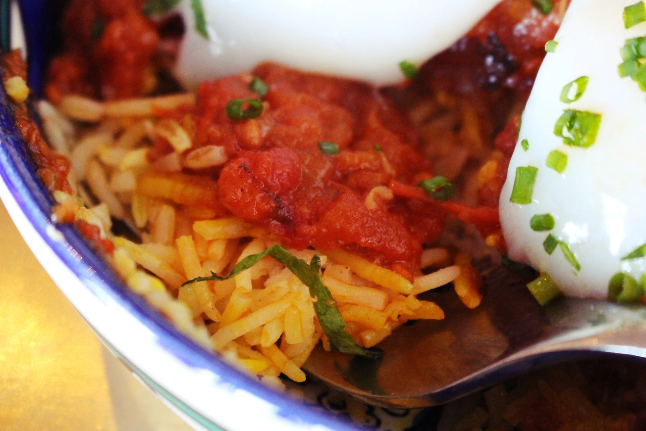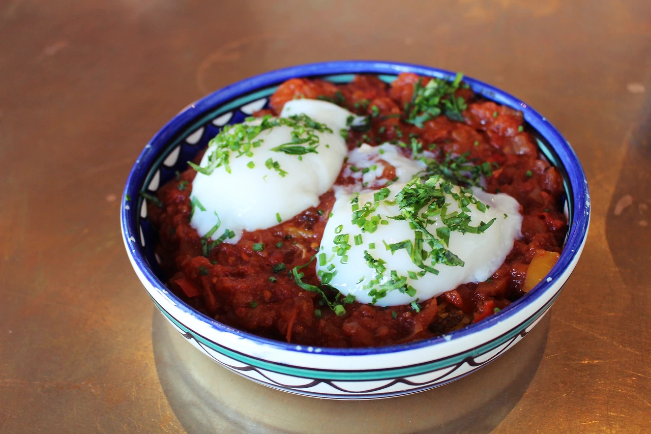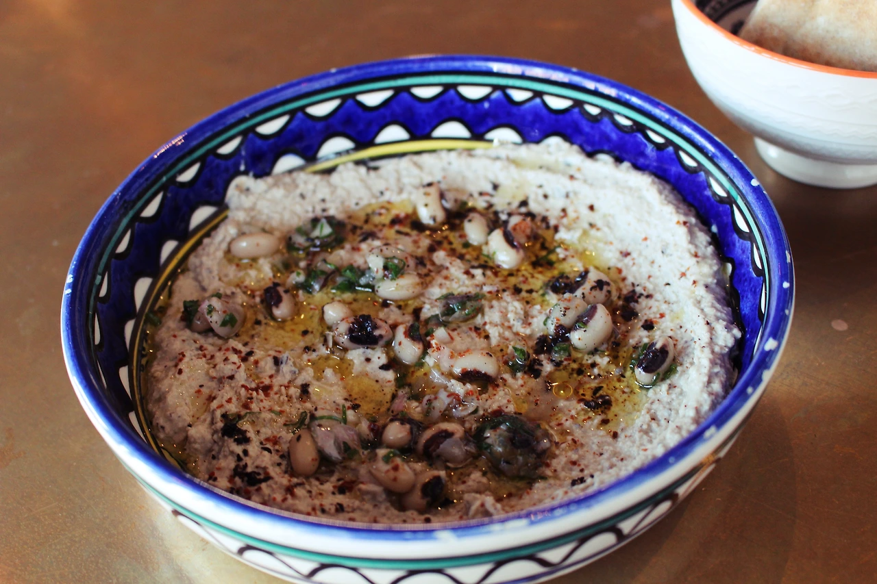 '에그 인 헬 Egg in hell'로도 알려진 샥슈카, 콩을 부드럽게 갈아 만든 후무스를 주문했다.