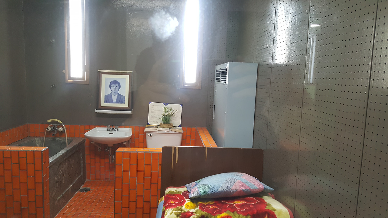 조사실은 3평 정도의 방 크기이다 방마다 1인용침대(조사를 받는자는 절대 누울수 없으나 조사중 건강상 위험시 긴급사태를 대비하기 위함)탁자,개방된 변기와 욕조가 각각하나씩 있었다 아이러니하게도 욕조는 성인이 몸 전체를