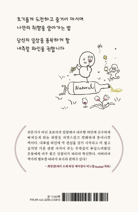 와인에 대한 관심이 더 깊어져서 내추럴 와인에 관련한 책도 쓰게 되었는데 제가 만들었던 독립출판을 보고 출판사에서 연락이 와서 출판하게 되었어요. 처음엔 ‘업계 사람이 아닌데 책을 내도 되려나?’ 생각했지만 애호가 입장에서 좋아하게 된 과정을 인스타툰 형식의 만화로 그려서 와인 초보자들이 보기에도 재밌고 어렵지 않게 읽을 수 있는 것 같아요.
