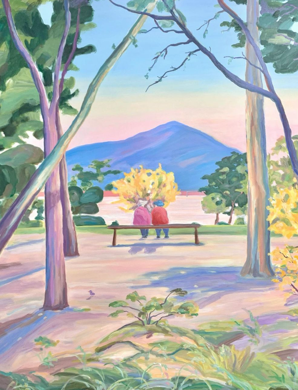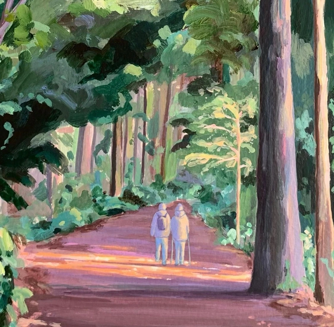 ‘그랜드캐니언’ 이후로 로드 트립을 계속했었어요. 거기서 보았던 풍경의 색감 톤이 그때 그렸던 색감과 많이 닮아 있어요. 이후 제가 좋아하는 톤을 계속 찾았던 것 같아요. 더 완전한 자연을 그리고 싶었어요. 그러다 팬데믹이 시작되었어요. 코로나가 유행하던 시절엔 여행을 잘 못 갔잖아요. 그래서 동네를 돌아다녔어요. 제가 사는 곳이 대학가인데, 그 대학은 주변 자연이 아름답고 조경이 잘 조성되어 있거든요. 사람들이 자연이랑 같이 있는 모습이 귀엽기도 하고, 혼자 있는 사람들도 많고, 서로 같이 어울리기도 하는 모습들을 찾을 수 있었어요.