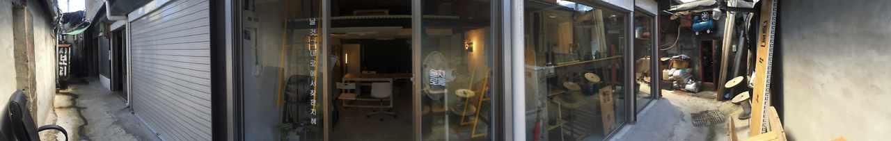정말, 천막 하나를 사이에 두고 실내와 실외가 구분되었었죠. 골목 초입에 들어서면 큰 창으로 통해서 작업실이 보였어요. 골목을 꺾어 들어왔을 때 이질적이지만 자연히 녹아 있는 공간이 되길 바랐었어요. 살짝 안쪽이어서 인지 사장님들이 담배도 많이 피우시고, 간혹 대소변을 보는 사람들도 있었어요.