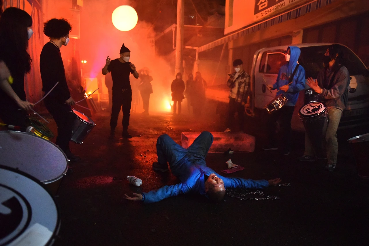 Desperate, I thought, "What if I start dancing?". Though I was wearing a mask, latex gloves, and an apron for the planned tattoo performance, I just started dancing alone. Slowly, people gathered, drawn in by the energy. To my surprise, the performance turned into a huge success, forming a lively crowd.