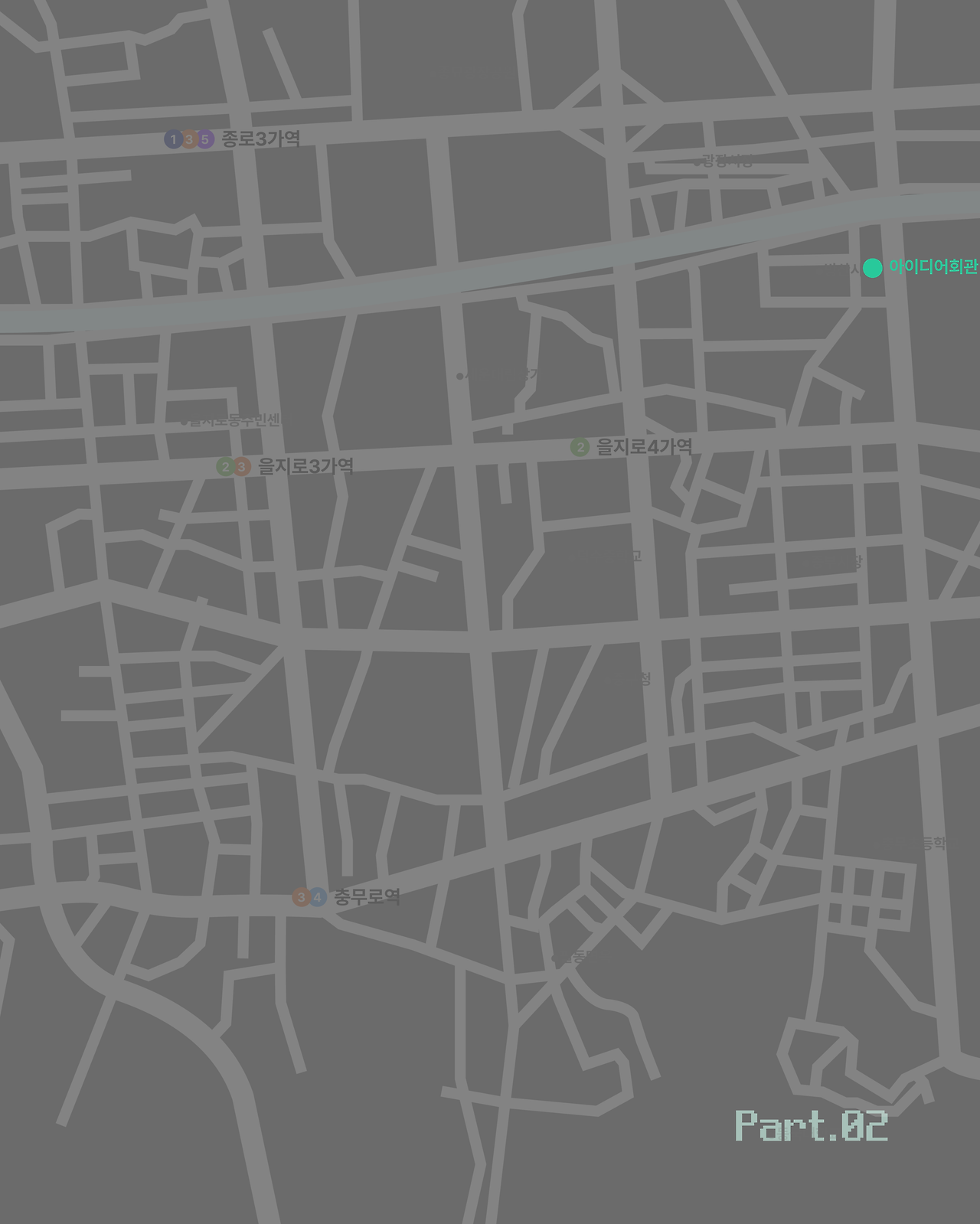 을지로는 서북쪽으로 MMCA, 동쪽으로 DDP, 남쪽으로 LEEUM 같은 대형 미술관에 중심에 놓여 있습니다. 반면, 을지로 곳곳에는 작은 예술공간이 지표면을 따라 펼쳐져 있습니다. 많은 예술가가 낡은 건물에 입주해 목적에 맞게 공간을 수선하고, 각자의 방식으로 운영해 왔습니다. 이런 미시적 실천은 작가들의 성장을 견인했고, 대형 미술관이 을지로에서 성장한 작가들의 전시를 기획하는 선순환으로 이어졌습니다. 현대 미술의 주춧돌 중 하나가 을지로라고 해도 과언이 아닐 것입니다.