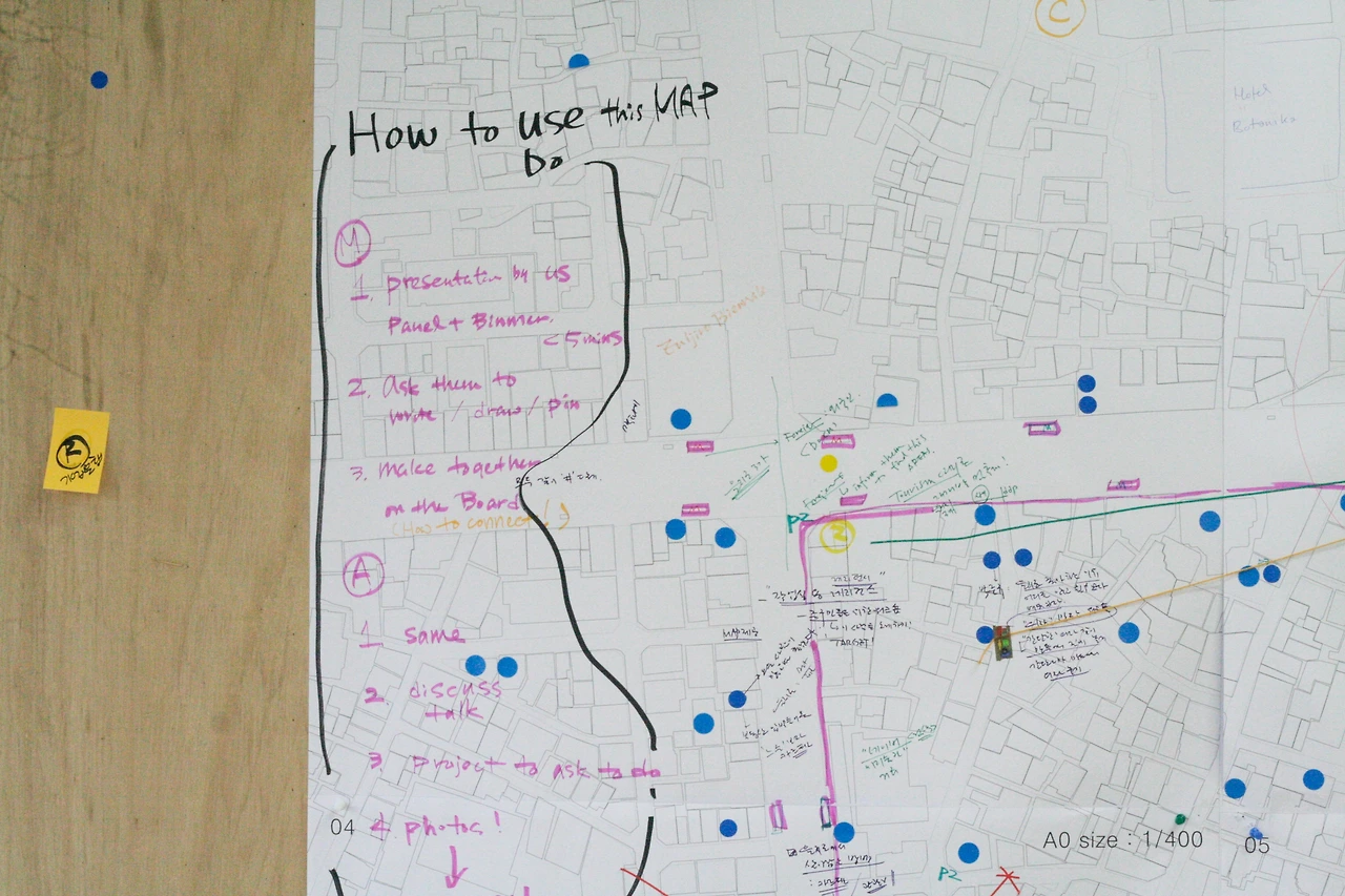 정비에 앞서 이들은 넓은 주차장을 딸린 작은 창고를 청소·정리해 누구나 올 수 있는 열린 공간으로 바꾸었습니다. 그곳에서 향긋한 와플을 구우며 지나가는 사람들을 유혹해 자연스럽게 들어오도록 했고, 와플과 맥주를 나누며 지역에 대한 각자의 이야기를 수집했습니다. 어르신과 아이들, 상인과 시민(필요시 행정 담당자까지) 누구나 찾아와 자신이 생각하는 지역, 바라는 점과 아쉬움을 남길 수 있었고, 그 내용은 실제 재정비 설계에 반영되었습니다.