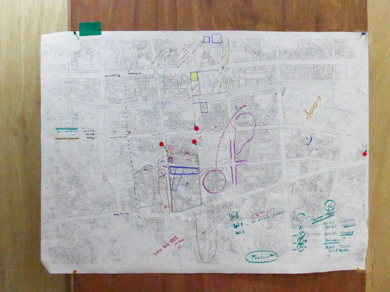 그의 제안은 상당히 구체적이었습니다. 비어 있는 거리 가판대 활용, 골목 곳곳의 안내판 설치, 각 예술공간을 한눈에 인식할 수 있는 깃발 등의 표시물 설치였습니다. 완성도가 높은 구상안 덕분에 현장의 구현 가능성이 뚜렷하게 전해졌으며 바로 공공에 제안해 보면 좋겠다는 생각이 들 정도였습니다.