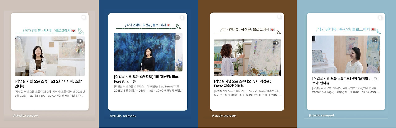작업실을 같이 사용하시는 분들 중 오픈스튜디오를 하실 분을 정하고, 그 기간에 맞춰 인터뷰를 병행하고 있어요. 작품을 다 꺼내놓는 김에 한번 정리하고 가기 위해 인터뷰를 남겨놓는다고 봐주시면 돼요.