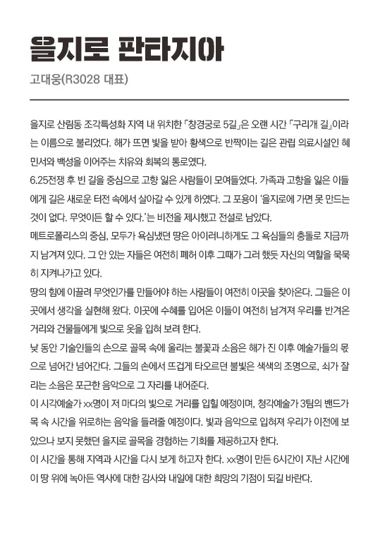 언제부터인가 쇠를 갈아내던 소리가 가득했던 을지로 뒷골목에서 음악이 들리고 거리는 빛으로 물들었습니다. 을지로에서 활동하는 기획자, 예술가들이 「을지로 판타지아」라는 이름으로 벌인 일들이었습니다. 600년간 그곳에 있었던 길은 하룻밤 전혀 다른 곳으로 변했습니다.