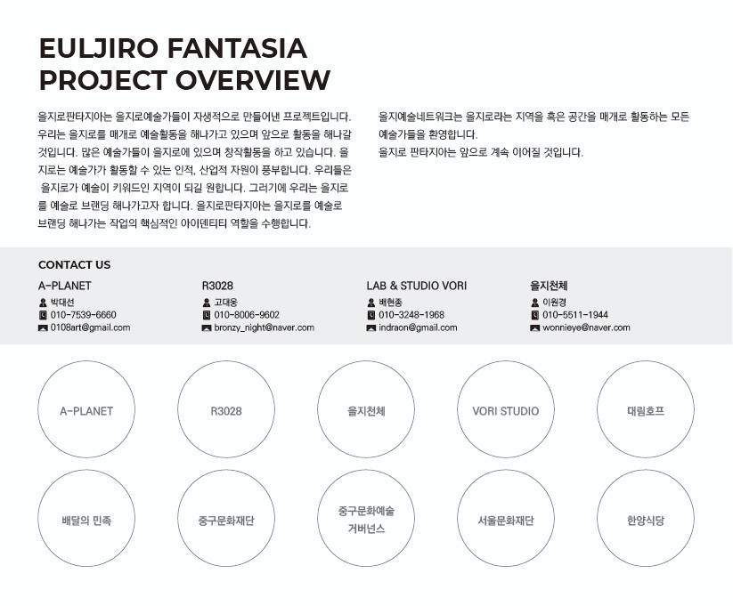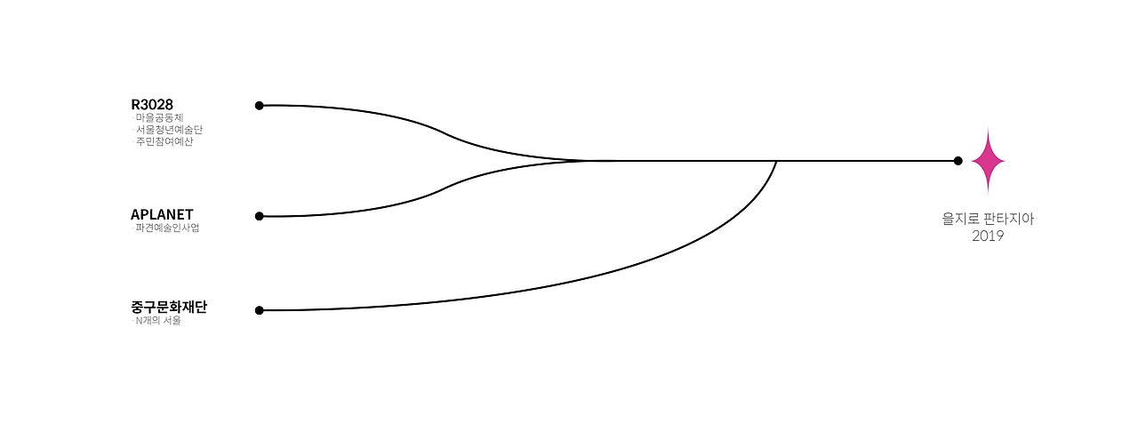이전에 없었던 새로운 시도로 '을지로 판타지아'를 만들기로 한 R3028과 APLANET은 각자의 캐비닛에서 예산과 사업들을 꺼내 보았습니다. 예술인 파견사업, 주민공모사업 등 결합해서 가용가능한 지점들을 찾아낼 수 있었습니다. 공간 구성은 어디서부터 어떻게 만들어야 할지, 욕망과 현실 사이 어느 영역까지 가능할지에 대한 그림을 그려봤지만 도로 통제, 홍보, 운영인력 등 해결하기 어려운 문제들이 있었습니다. 결국 공공의 도움을 청하기로 하였습니다. 그렇게 페이퍼 한 장을 들고 중구문화재단을 찾아갔습니다.
