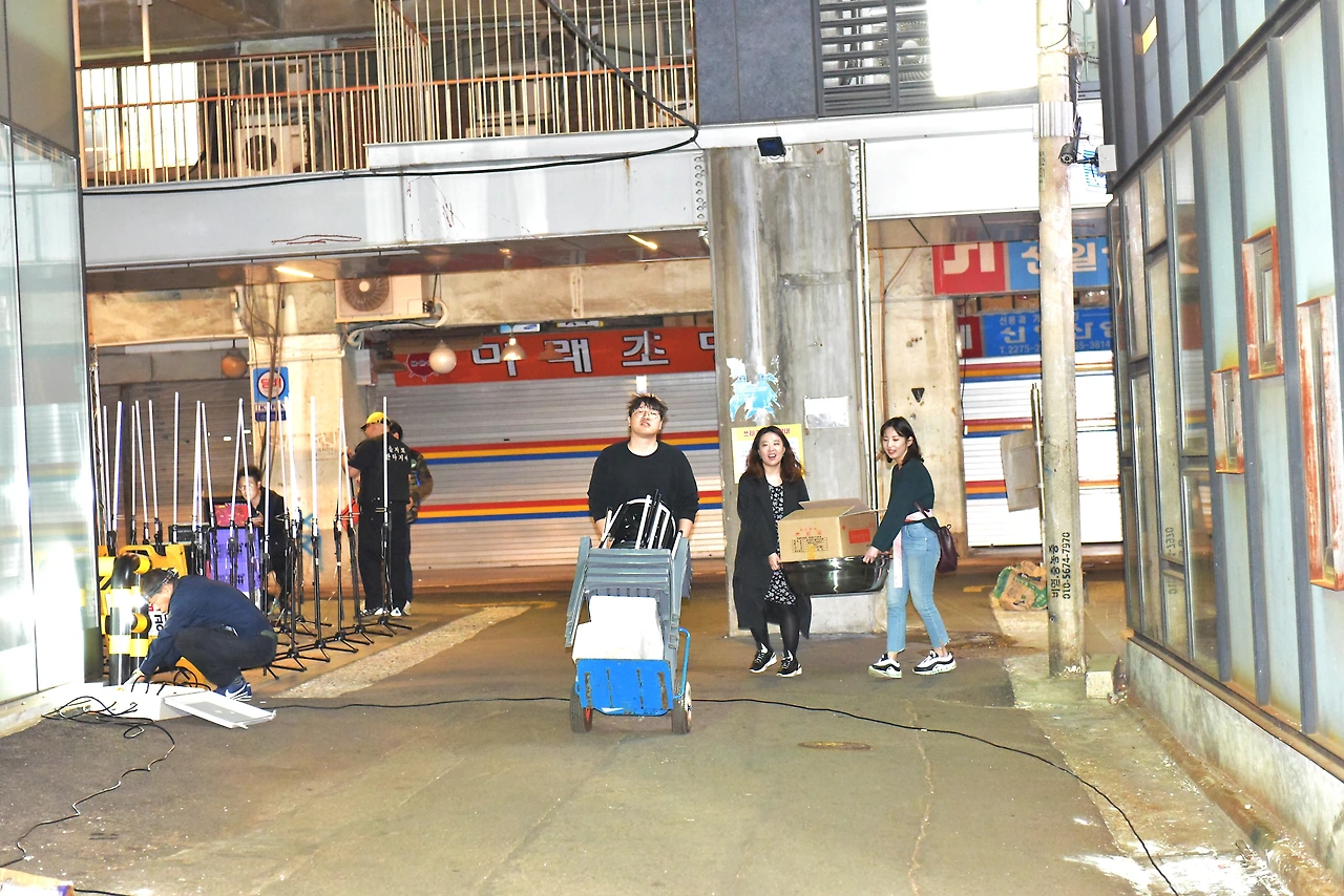 아름다운 예술도 언제나 진창에서 시작됩니다. '을지로 판타지아'를 만드는 과정 또한 그랬습니다. 특히 2019년 10월 12일 토요일이 그랬습니다. 행사 시작 시간은 오후 6시. 오후 3시경부터 철공소가 문을 닫기 시작하기에 반에 반나절이 설치 가능한 시간의 전부였습니다. 급박한 설치 작업이 시작되었습니다. 전선을 깔고 작품을 설치하고 장비를 설치하는 분주한 시간이었습니다. 여느 미대 입시 현장이 이랬을까요. 퇴근길에 나선 사장님들은 일과시간보다 오히려 분주해진 골목의 풍경이 생경하고 재미나셨는지 무슨 일이 있는지 물으시고 관망하셨습니다.