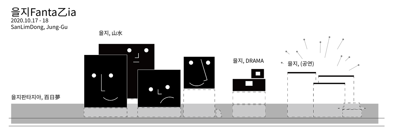 행사명은 결국 「을지판타지아」로 변경되었습니다. 2019년에 「을지로 판타지아」라 불렀던 거리 전시/행사는 「을지, 판타지아 : 백일몽」이라 불리며 기획의 일부로 병합되었고, '을지예술센터'의 개관 전은 「을지, 드라마」, 산림동 건물 외벽에 그림을 설치하는 전시는 「을지, 산수」라는 이름으로 불리게 되었습니다. 그리고 그 모든 예술행사의 제목을 「을지판타지아」라 칭하기로 했습니다. 「을지판타지아」 안에 「을지판타지아」가 있는 다소 기괴한 구조가 생겨나게 되었습니다.