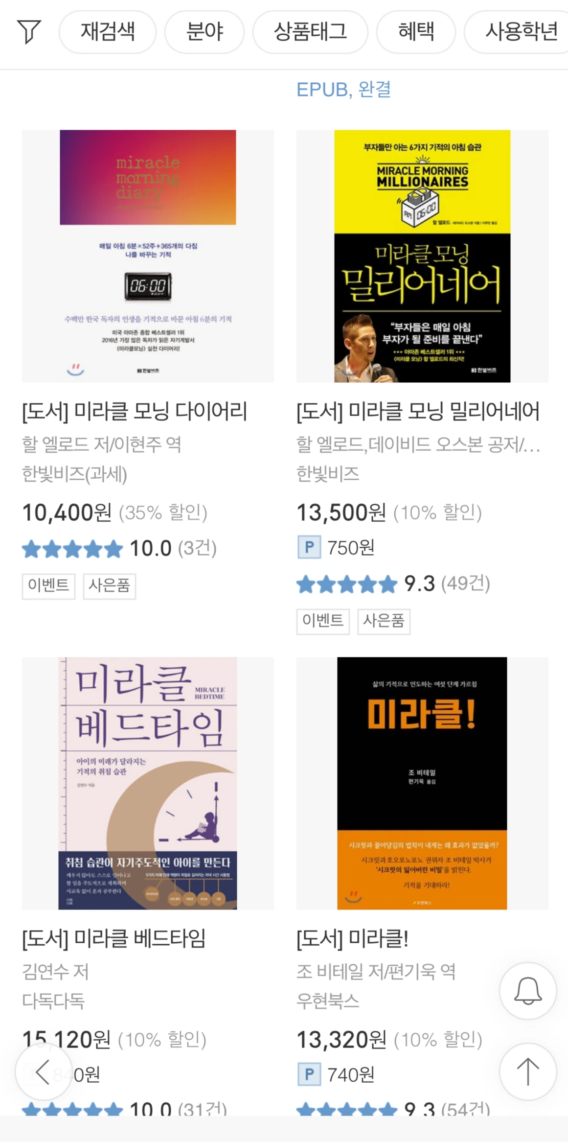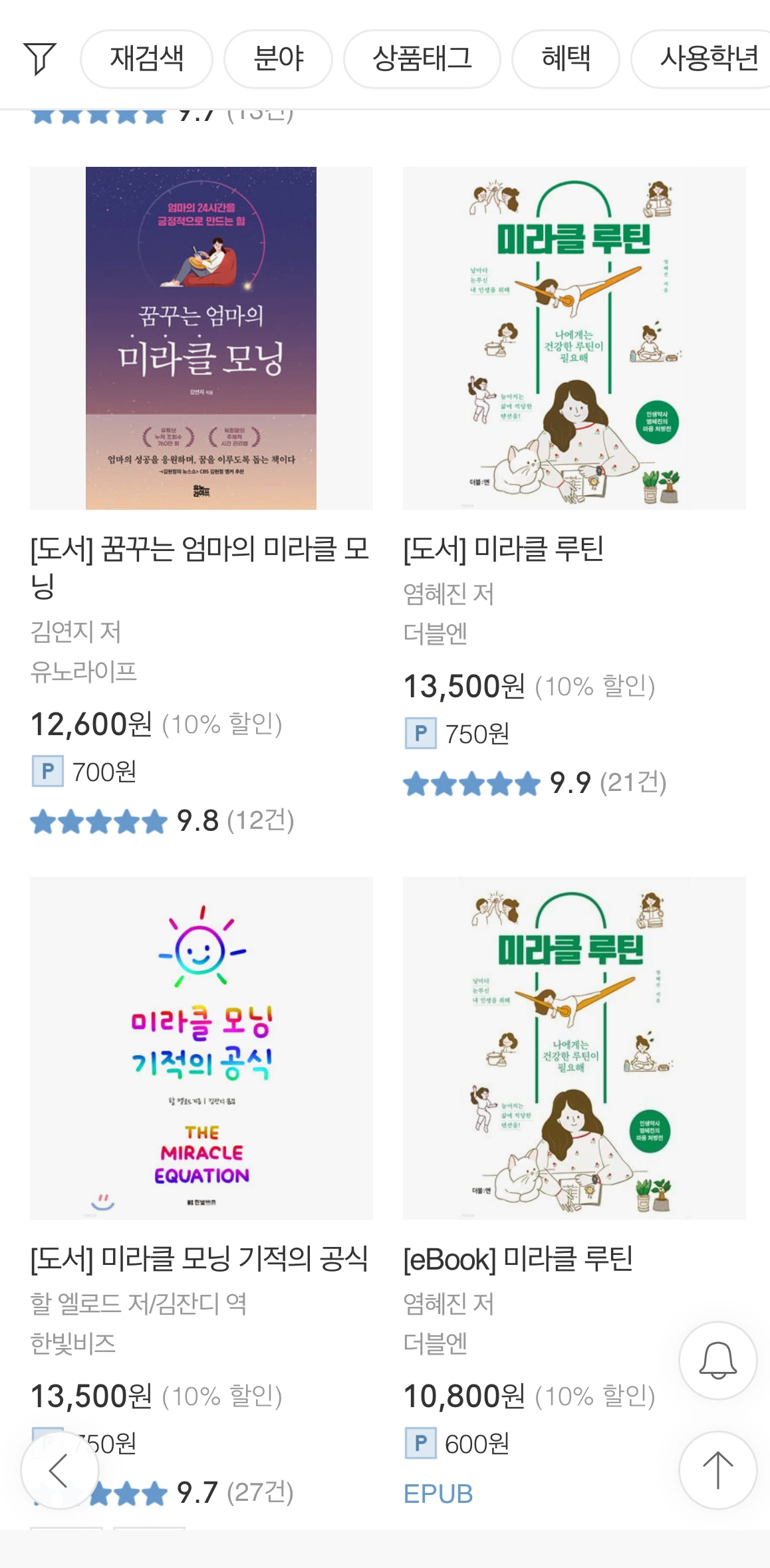 어학, 건강, 학습, 육아 등 분야를 가리지 않고 엄청난 책들이 "기적"이라는 제목을 달고 나와있다.